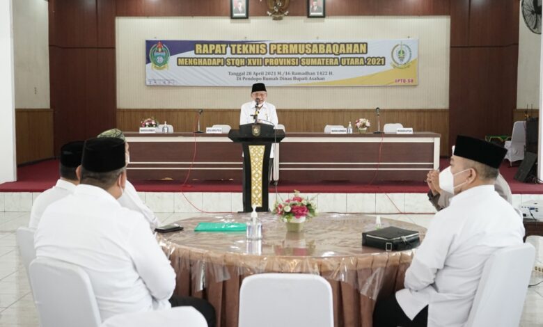 BeritaNasional.ID, Kisaran – Bertempat di pendopo rumah dinas Bupati Asahan, Rabu (28/04/2021), Lembaga Pengembangan Tilawatil Qur’an (LPTQ) Sumatera Utara menggelar Rapat Teknis Permusabaqahan menjelang pelaksanaan kegiatan Seleksi Tilawatil Quran dan Hadits (STQH) ke – XVII Provinsi Sumatera Utara.