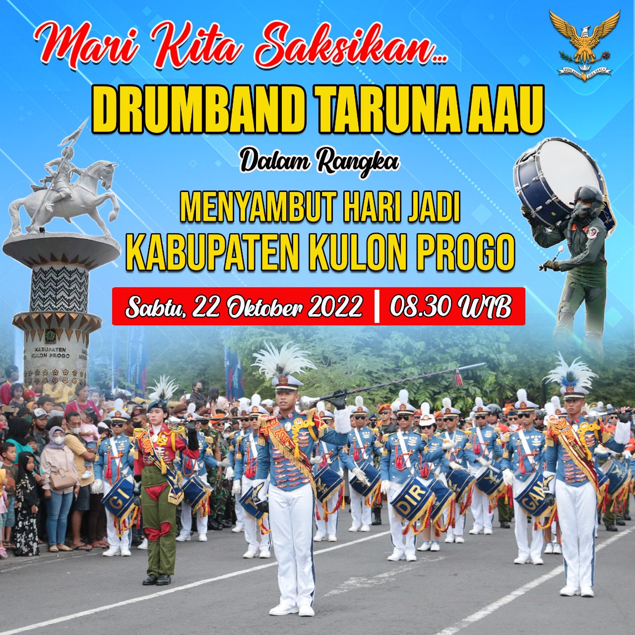 Yogyakarta, BeritaNasional.ID – Menyambut Hari Jadi Kabupaten Kulon Progo, Para Karbol (Taruna AAU) akan melaksanakan Kirab dan Display Drumband “Gita Dirgantara” di Pusat Kota Kulon Progo pada hari Sabtu tanggal 22 Oktober 2022 dari Pukul 08.30 s.d. 10.00 Wib.