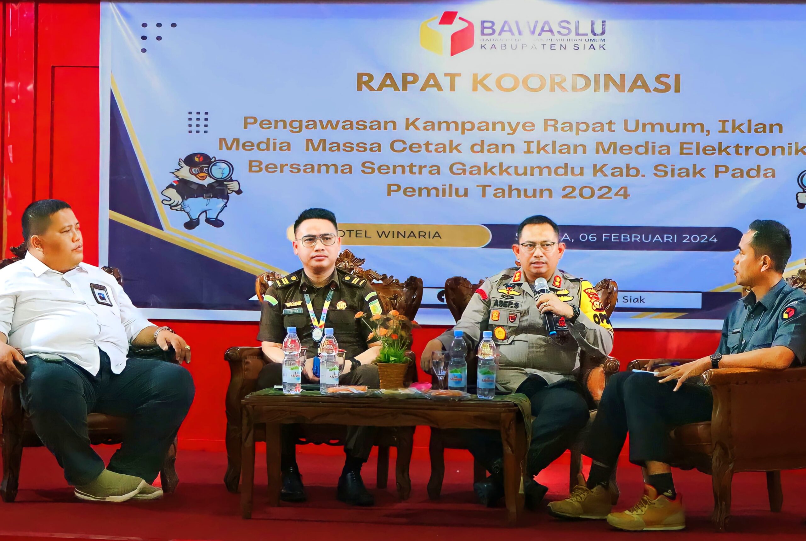 BeritaNasional.ID,SIAK RIAU – Rapat Koordinasi Bawaslu (Badan Pengawas Pemilu) dalam Pengawasan Kampanye Pemilu 2024 melalui iklan Media Masa Cetak dan Media Elektronik, Kapolres Siak, AKBP Asep Sujawardi turut hadir menjadi narasumber bersama Sentra Gakkumdu Kabupaten Siak yang digelar di Hotel Winaria, Kecamatan Siak, Kabupaten Siak. Selasa(6/2/24)