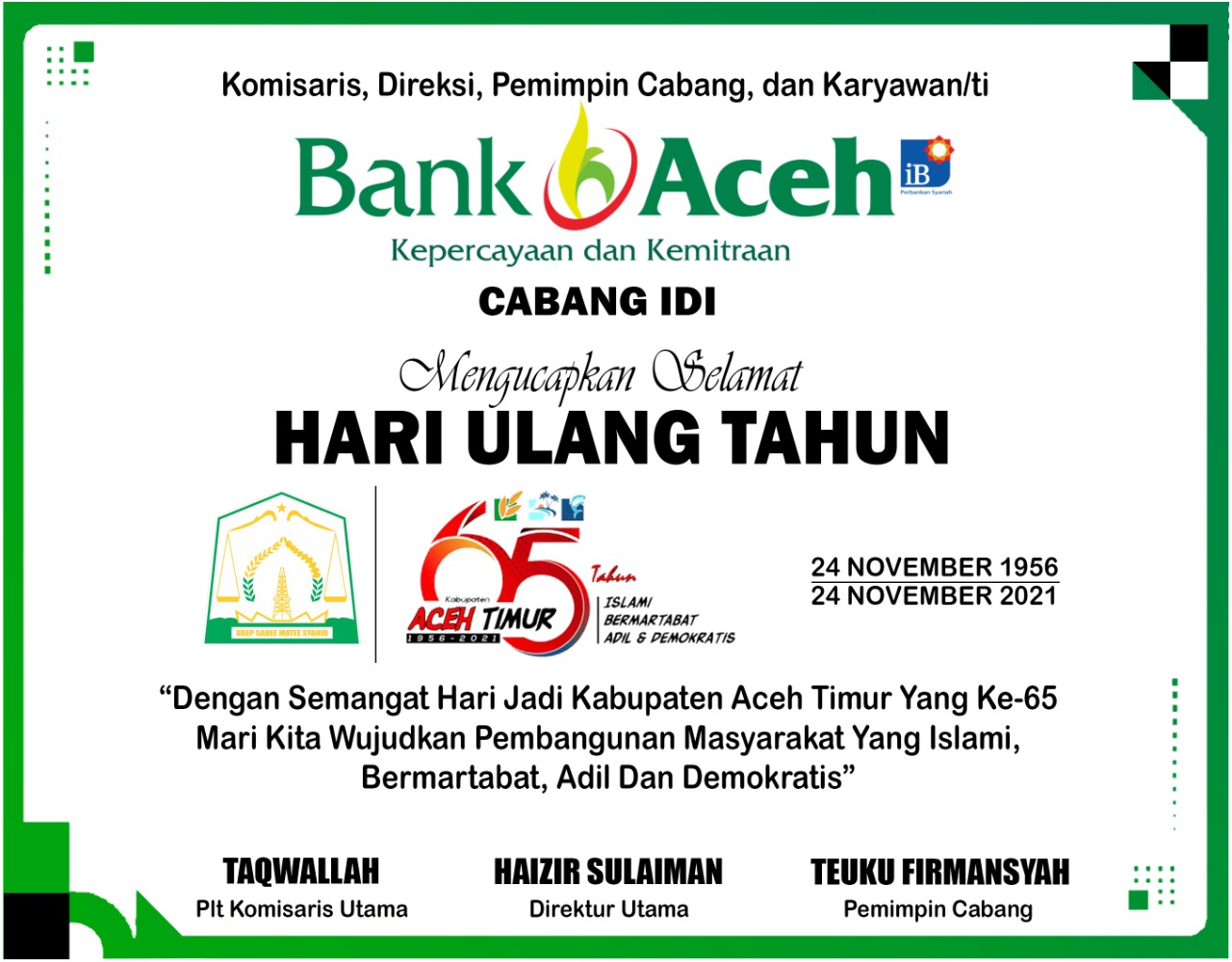 “Kami atas nama keluarga besar Bank Aceh Syariah cabang Idi mengucapkan selamat hari jadi Kabupaten Aceh Timur yang ke-65” ucap Pimpinan BAS cabang Idi.