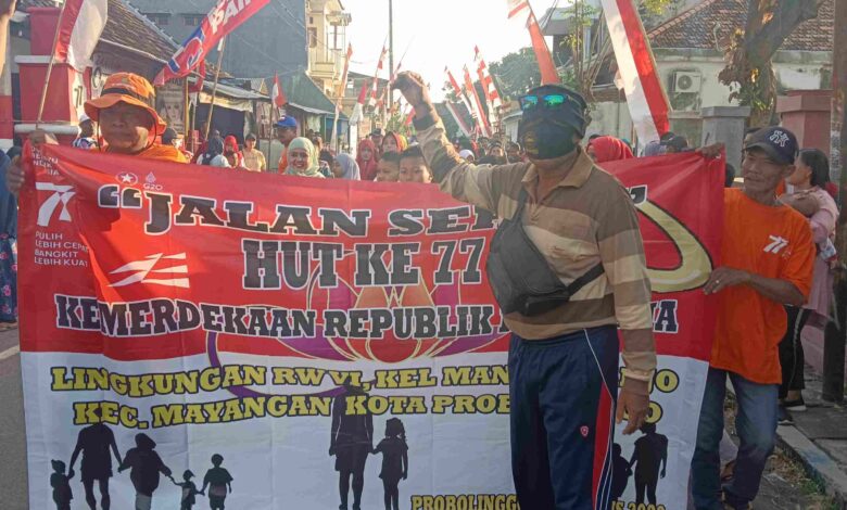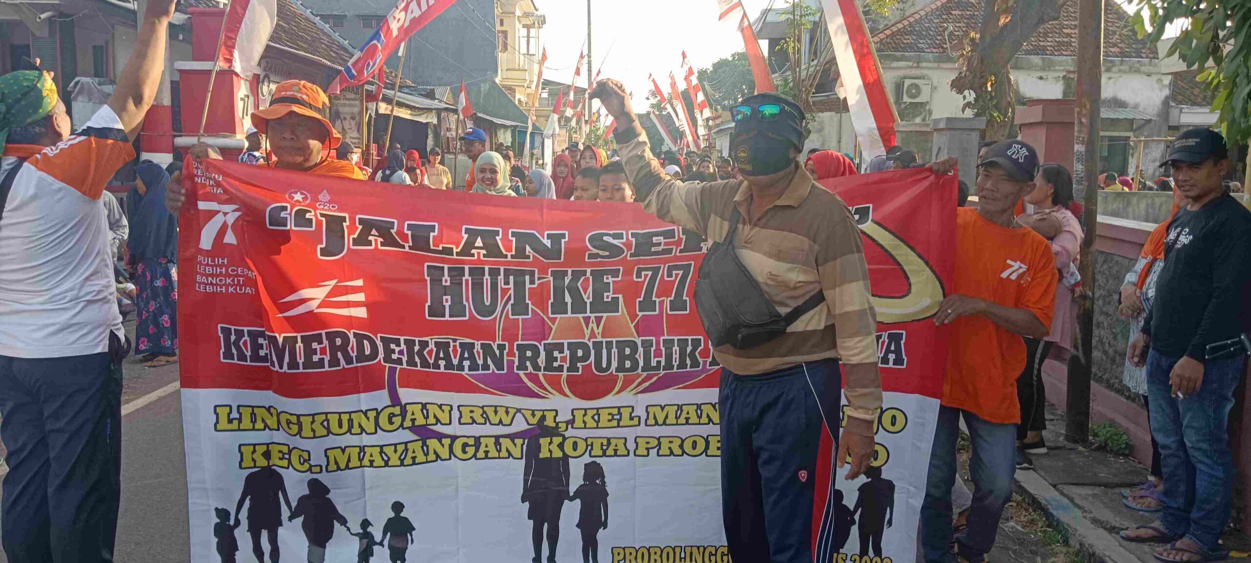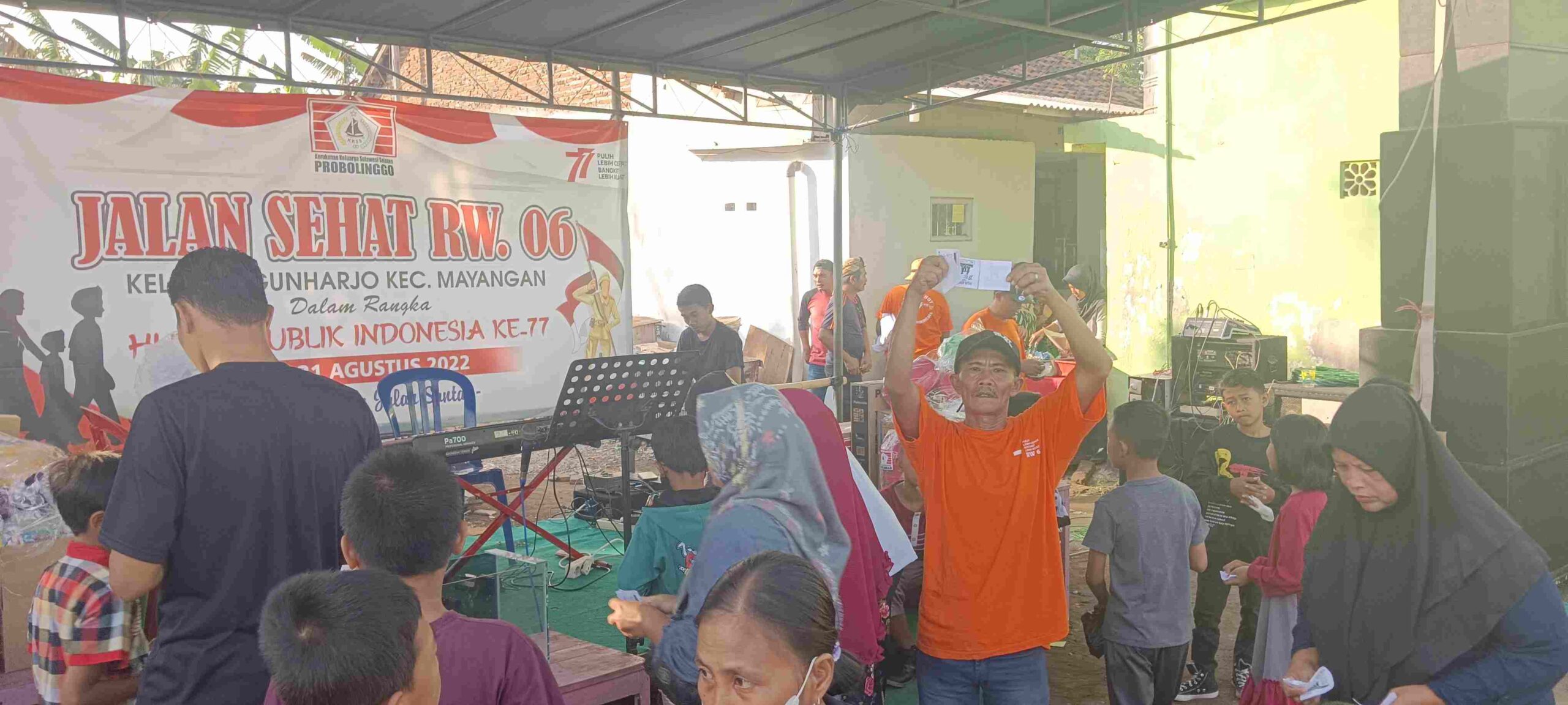 Menyemarakan HUT Kemerdekaan ke-77 Republik Indonesia (RI) Ketua RW 6 Kelurahan Mangunharjo Kota Probolinggo mengadakan jalan sehat yang di selenggarakan di jalan Serma Abdurrahman , Minggu (21/8).