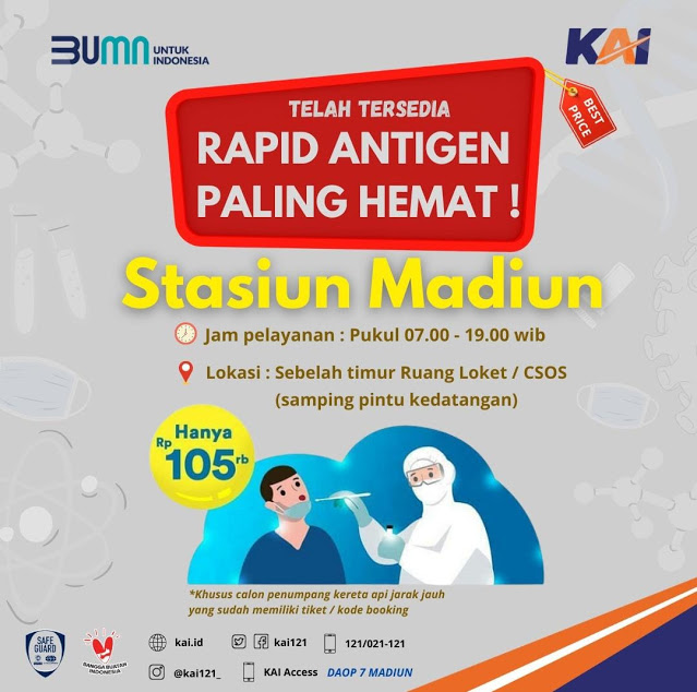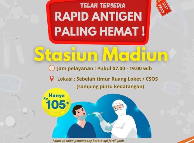 “Untuk memudahkan pelanggan yang akan naik KA, mulai hari ini Rabu (23/12/2020) di Stasiun Madiun telah kita sediakan pelayanan Rapid Tes Antigen,” ungkap Manager Humas KAI Daop 7 Madiun, Ixfan Hendriwintoko.