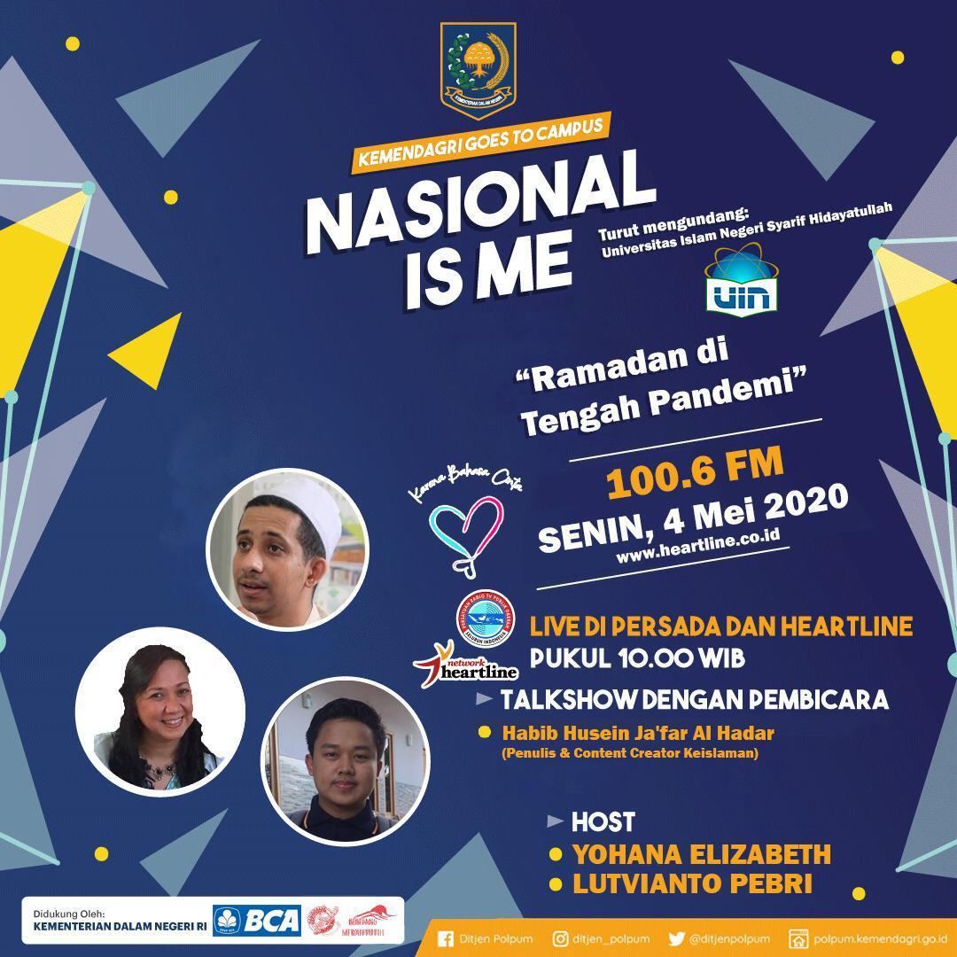 Kali ini, program Nasional Is Me, mengupas tema,” Ramadan di Tengah Pandemik”, dengan narasumber utama Habib Husein Ja’far Al Hadar. Ada pun yang memandu diskusi adalah Ketua Yayasan Bentang Merah Putih Yohana Elizabeth Hardjadinata dan Lutvianto Pebri.