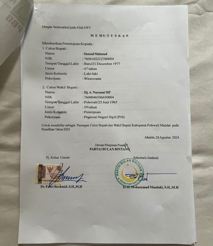 Terbaru, Dewan Pimpinan Pusat Partai Bulan Bintang (DPP PBB) telah menerbitkan rekomendasi B1KWK ke pasangan .H. Samsul Mahmud atau Aji Assul (AA) dan A. Nursami, MP. Rekomendasi final ini diterima lansung oleh Tim Aji Assul (AA) di kantor DPP PBB di Jakarta, Sabtu 24 Agustus 2024. Sekjen DPP PBB H. Mohammad Masduki menyatakan, surat persetujuan Model B.1 merupakan persetujuan parpol KWK menjadi salah satu syarat untuk pendaftaran pasangan ke Komisi Pemilihan Umum (KPU). Dengan diserahkan surat model B.1 persetujuan Parpol KWK kepada H. Samsul Mahmud, maka diminta untuk segera melakukan konsolidasi di daerah dan koordinasi dengan pengurus PBB yang ada di Polewali Mandar.