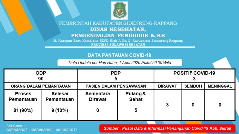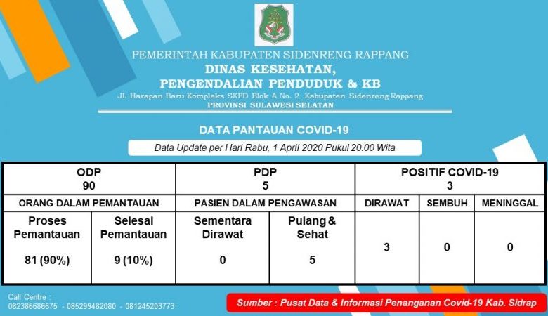 “Dengan demikian jumlah pasien positif Covid-19 Sidrap saat ini menjadi tiga orang,” ungkap Ishak Kenre, Kamis pagi 2 April 2020.