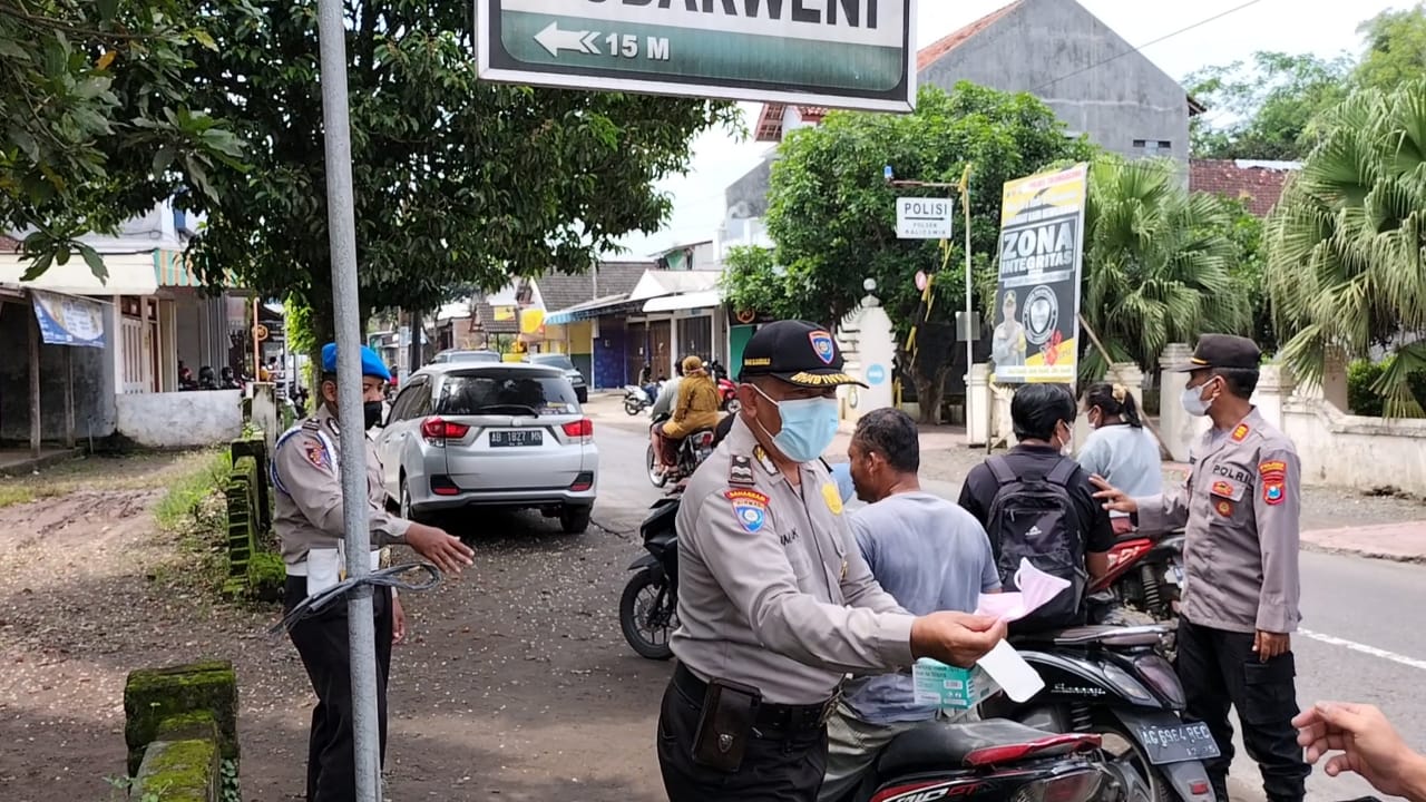 Dengan cara Ops. Yustisi, Personil Polsek ajak pengendara di Jalan Umum Desa Karangtalun, Kecamatan Kalidawir disiplin Prokes.