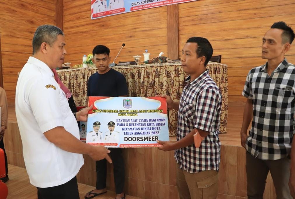 Penyerahan bantuan peralatan usaha UMKM Kota Binjai yang tersebar di 5 kecamatan terdiri dari 60 UMKM Penerima Bantuan Alat Usaha Stelling Rak Roda, 38 UMKM Penerima Bantuan Alat Usaha Stelling Display Roda, 16 UMKM Penerima Bantuan Alat Usaha Potong Bambu Roda, 29 UMKM Penerima Bantuan Alat Usaha Compressor Roda, 25 UMKM Penerima Bantuan Alat Usaha Doorsmeer, 15 UMKM Penerima Bantuan Alat Usaha Bubut Ayam, 10 UMKM Penerima Bantuan Alat Usaha Gerobak Bakso, 10 UMKM Penerima Bantuan Alat Usaha Gerobak Sate, 40 UMKM Penerima Bantuan Alat Usaha Cup Sealer, 15 UMKM Penerima Bantuan Alat Usaha Oven. (bay)