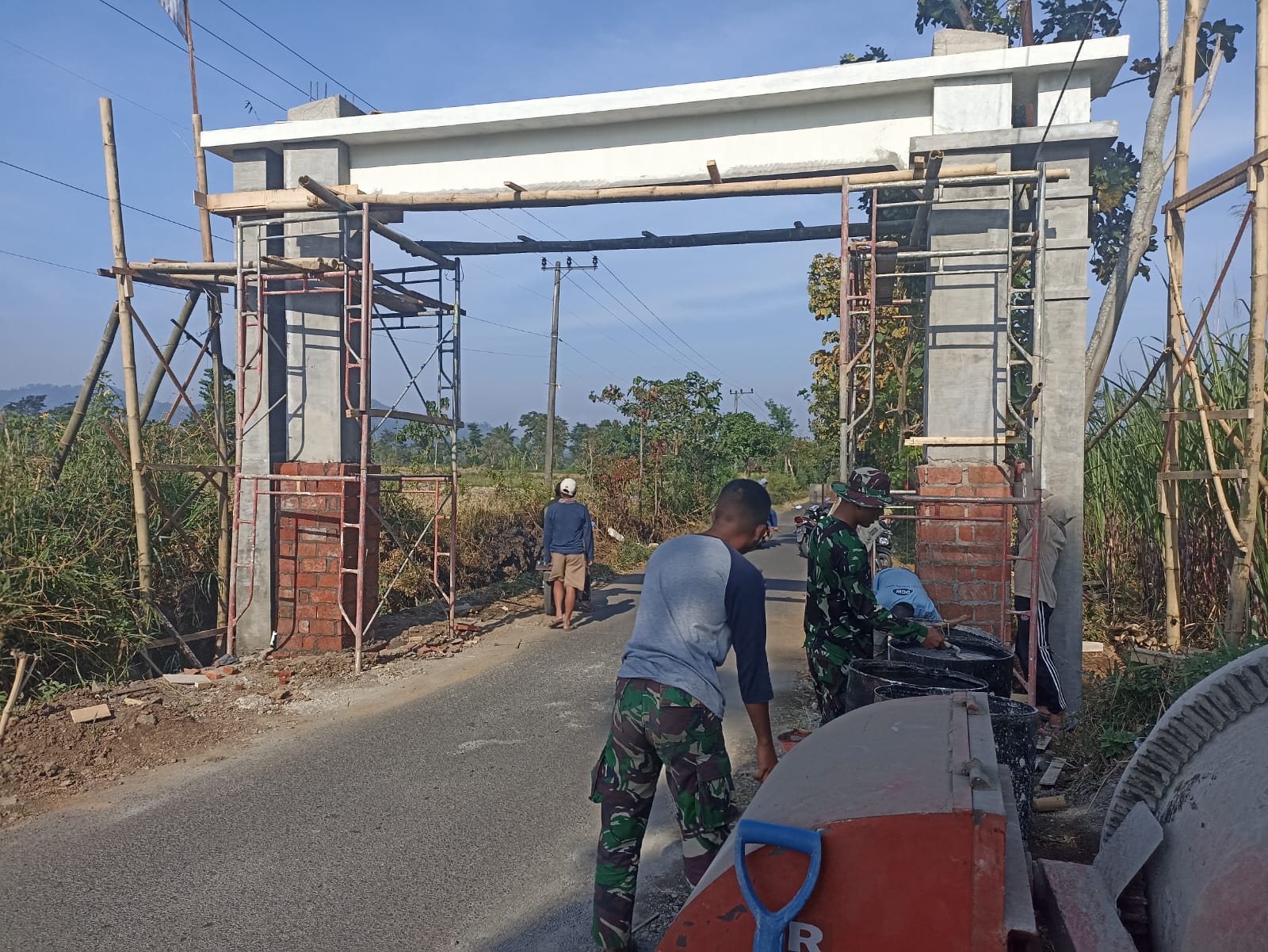 BeritaNasional.ID, BONDOWOSO JATIM – anggota Satgas TMMD ke 116 kodim 0822 Bondowoso kebut pengerjaan pembuatan gapura yang terletak di desa Pecalongan, berbatasan dengan desa Kerang Kecamatan Sukosari, Jum’at (2/6).