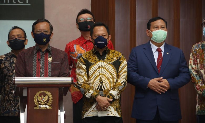 Pemerintah yang diwakili Menko Polhukam Mahfud MD, didampingi Mendagri Muhammad Tito Karnavian, Mensesneg Pratikno, Menhan Prabowo Subianto, Menkumham Yassona Laoly, dan MenPAN-RB Tjahjo Kumolo menyerahkan Draft Rancangan Undang-Undang Badan Pembinaan Ideologi Pancasila (RUU BPIP) ke DPR, Kamis (16/07/2020). Usai penyerahan draft tersebut, Pemerintah dan DPR menggelar konferensi pers. (Rls/Br)