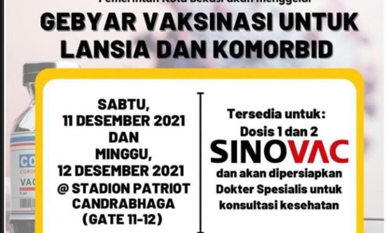 BeritaNasional.ID, KOTA BEKASI – Pemerintah Kota Bekasi akan menggelar Gebyar Vaksinasi Covid-19 untuk lansia dan orang yang memiliki riwayat penyakit komorbid pada Sabtu tanggal 11 dan 12 Desember 2021. Gebyar Vaksinasi tersebut akan dilaksanakan di Stadion Patriot Candrabhaga Gate 11-12.