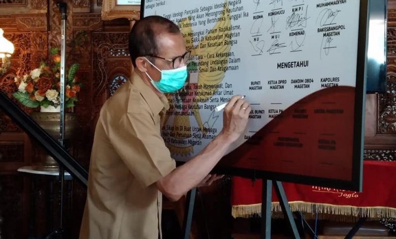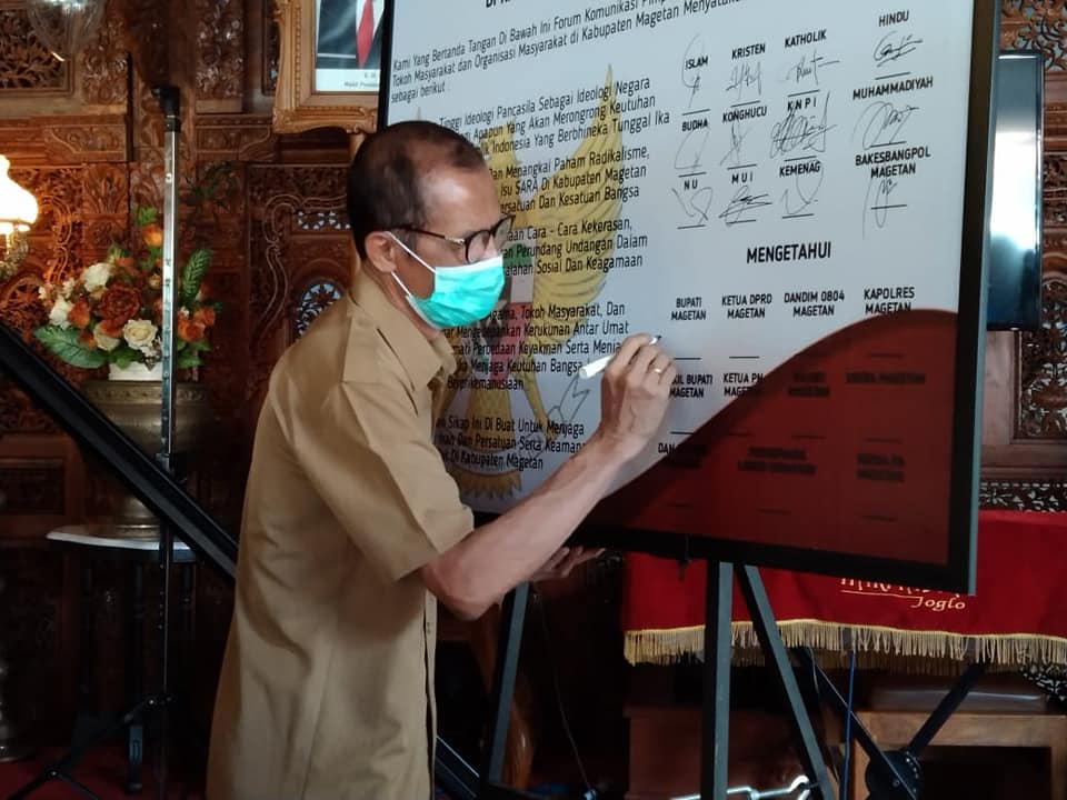 Bupati Suprawoto juga menyampaikan bahwa deklarasi dan penandatanganan sikap tersebut sebagai wujud komitmen untuk memberantas tumbuh dan berkembangnya paham pemecah persatuan dan kesatuan bangsa di Magetan
