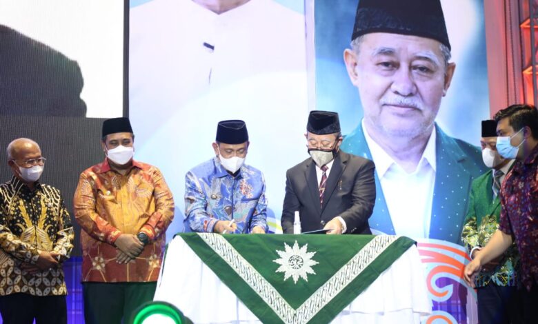 Penandatanganan yang di dirangkaikan dengan milad ke-109 Muhammadiyah tingkat Provinsi Sulawesi Selatan (Sulsel).  Antara Amran Mahmud dengan Rektor Unismuh Makassar, Ambo Asse.