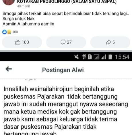 Beritanasional.id Probolinggo – Seorang ibu dikabarkan mendapatkan penolakan oleh Puskesmas Pajarakan Kabupaten Probolinggo saat dirinya ingin melahirkan di Puskesmas tersebut . Akibatnya, bayi yang dilahirkannya pun meninggal dunia.