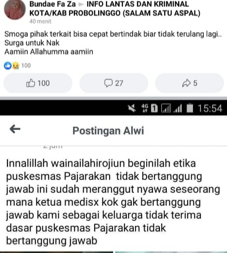 Dalam postingan itu tertulis, bahwa pihak Puskesmas tidak bertanggung jawab dan telah merenggut nyawa seseorang.