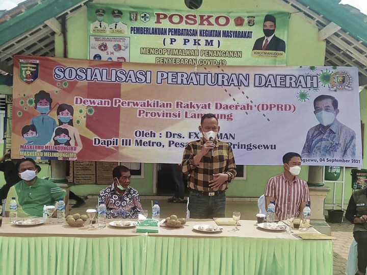 Sementara itu, anggota DPRD Provinsi Lampung FX Siman, selaku pihak penyelenggara sosialisasi mengatakan kegiatan sosialisasi dilaksanakan di ruang terbuka tanpa atap bertujuan agar seluruh peserta dapat menikmati sinar matahari pagi yang berguna untuk menambah imunitas tubuh. “Dengan berjemur sekaligus menjaga jarak, menggunakan masker serta mencuci tangan dengan sabun, merupakan tindakan pencegahan terpapar Covid-19”, katanya.