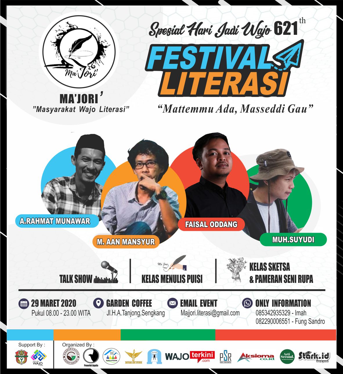 BeritaNasional.Id, Wajo – Dalam rangka memperingati Hari Jadi Wajo ke 621, Masyarakat Wajo Literasi (Ma’Jori) akan menggelar Festival Literasi  di Garden Coffee, Jln. H. A. Tanjong Sengkang, pada hari Minggu (29/3/2020) mendatang.