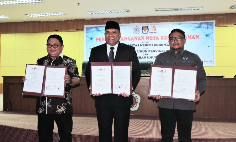 BeritaNasional.ID, GORONTALO – Untuk memperkuat peran aktif perguruan tinggi (PT) dalam mendukung penyelenggaraan pemilihan umum (Pemilu) yang berkualitas maka Universitas Negeri Gorontalo (UNG) melakukan kerjasama strategis dengan Komisi Pemilihan Umum (KPU) dan Badan Pengawas Pemilihan Umum (Bawaslu) Provinsi Gorontalo melalui penandatanganan Nota Kesepahaman (MoU) yang digelar di Aula Rektorat UNG, Selasa (09/01/2024).