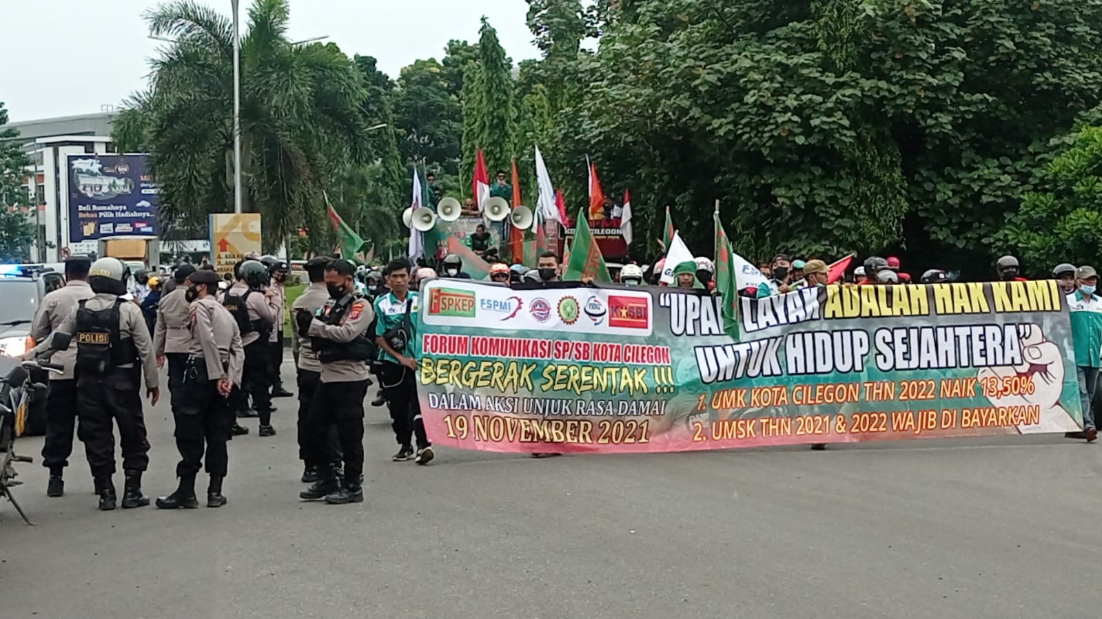 “Hari ini personel Ditpamobvit Polda Banten bersama personel Polres Cilegon dan Brimob Polda Banten, melakukan pengamanan aksi unjuk rasa yang dilakukan di kawasan PT Krakatau Stell”. Ucapnya