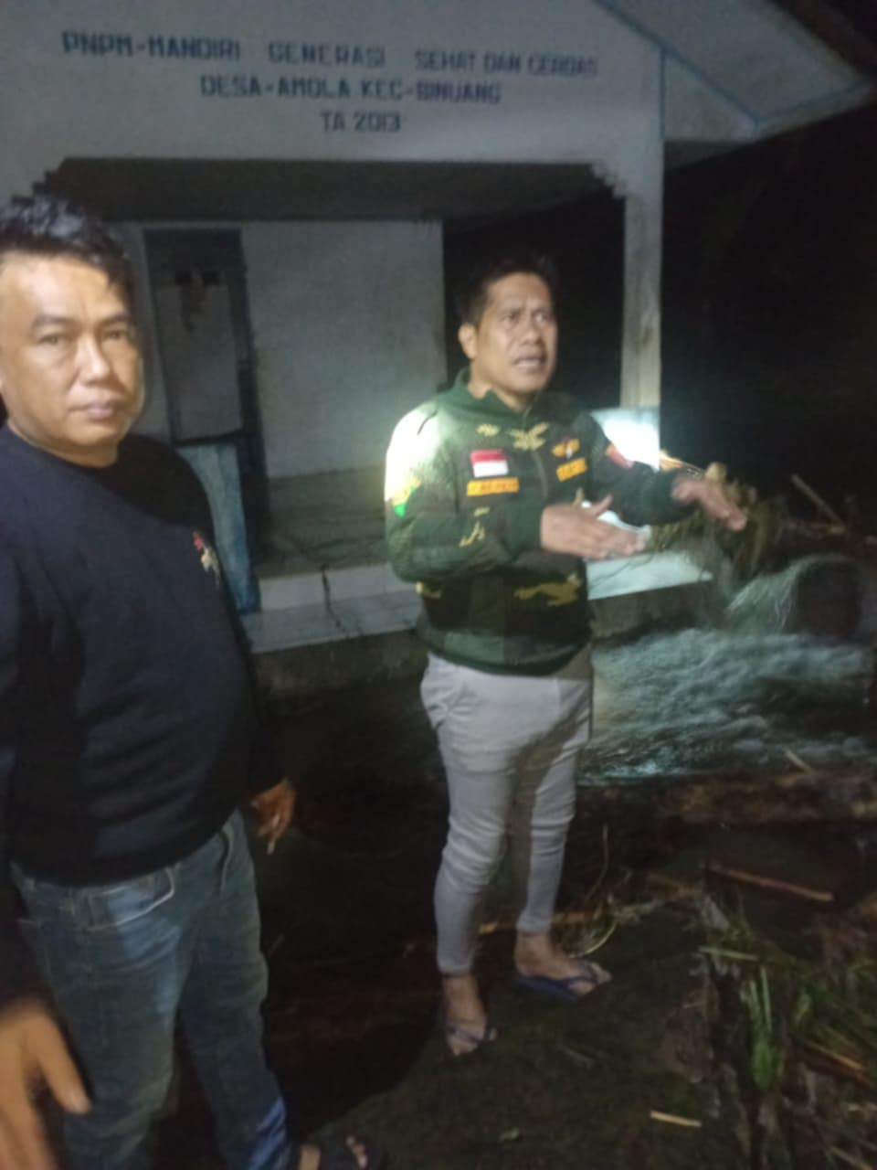 Meskipun hujan deras terus mengguyur sejak sore hingga malam hari, Hamzih tetap turun ke lapangan untuk memastikan kondisi warganya.