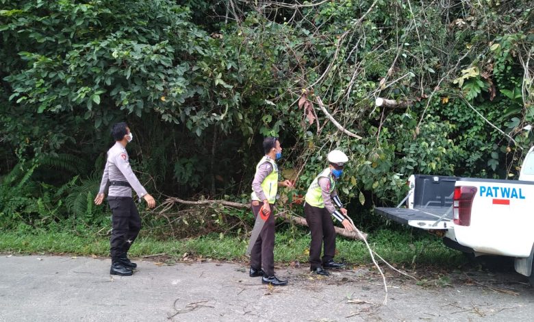 Pohon Tumbang ke Bahu Jalan, Satlantas Polres Sekadau Gerak Cepat Lakukan Evakuasi