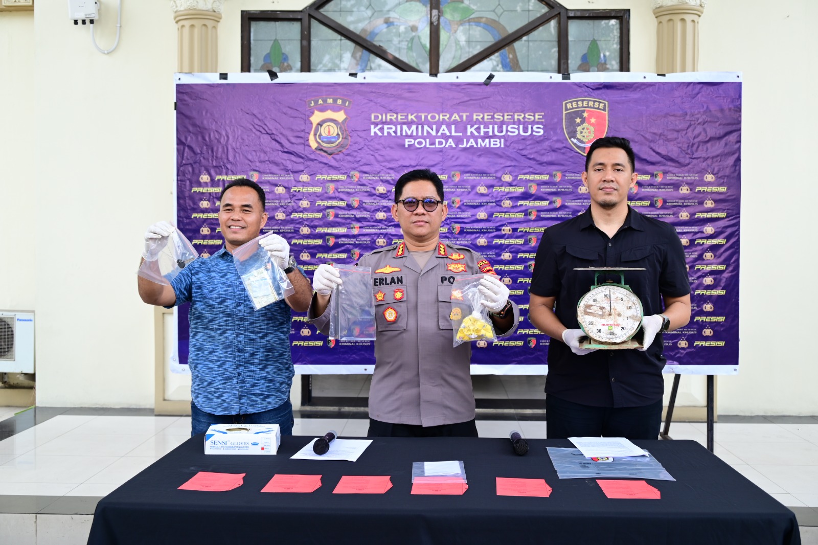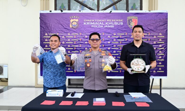 Konferensi pers dipimpin oleh Kabid Humas Polda Jambi Kombes Pol. Erlan Munaji, didampingi Kasubdit I Indagsi Ditreskrimsus Polda Jambi AKBP Hernawan Riski.