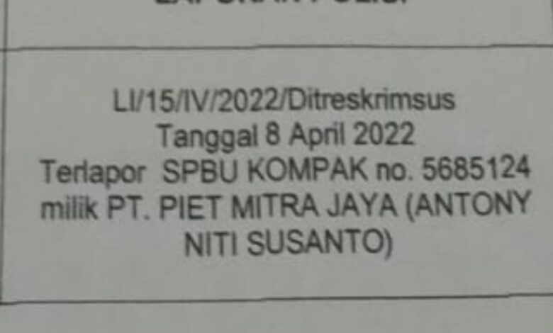 Dugaan kasus penyalahgunaan dan penimbunan BBM bersubsidi pemerintah ini sudah dilaporkan sejak 8 april 2022, dengan nomor : LI/15/IV/2022/Ditreskrimsus, dengan terlapor SPBU Nomor : 5685124 diduga milik PT. Piet Mitra Jaya, Antony Niti Susanto. “Kasus ini seharusnya sudah ada penahanan tersangka, pasalnya sesuai hasil gelar perkara sesuai barang bukti dan keterangan saksi ditemukan adanya penyalahgunaan / pengangkutan BBM bersubsidi pemerintah.
