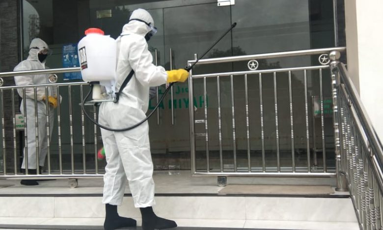 Subden KBR Gegana Brimob Polda Sumut menyemprotkan cairan disinfektan di Masjid Salamiyah Jalan Cempaka Medan. Penyemprotan di laksanakan meliputi wilayah areal masjid. Kamar mandi dan pagar akses keluar masuk masyarakat.