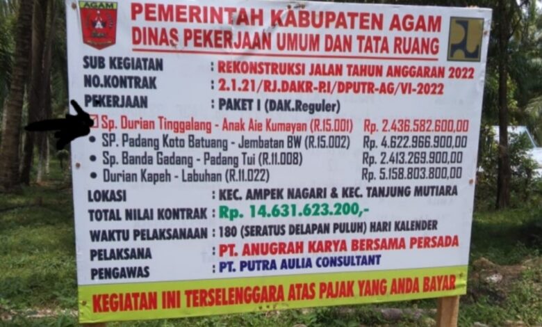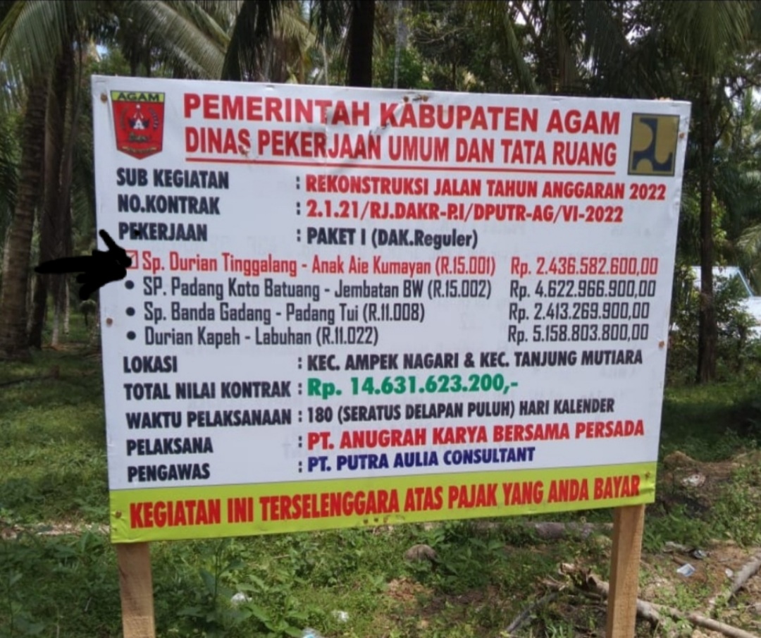 Diketahui, pekerjaan milik Dinas PU-PR Agam ini dikerjakan oleh PT, Anugrah Karya Bersama Persada dengan nilai pekerjaan Rp. 14.631.623.200,- yang diawasi oleh konsultan pengawas PT.Putra Aulia Consultant.
