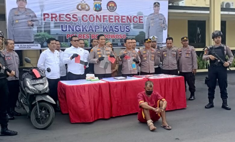 “Berdasarkan informasi dari masyarakat dan beberapa korban, pelaku berhasil kami amankan kemarin di Kecamatan Curahdami,” ungkap Kapolres saat konferensi pers di Mapolres Bondowoso, Senin (24/07/2023).
