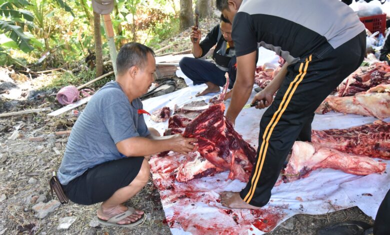 Usai pelaksanaan salat Id, Kapolres secara simbolis menyerahkan hewan kurban berupa seekor sapi kepada panitia dan dilanjutkan dengan penyembelihan hewan kurban.