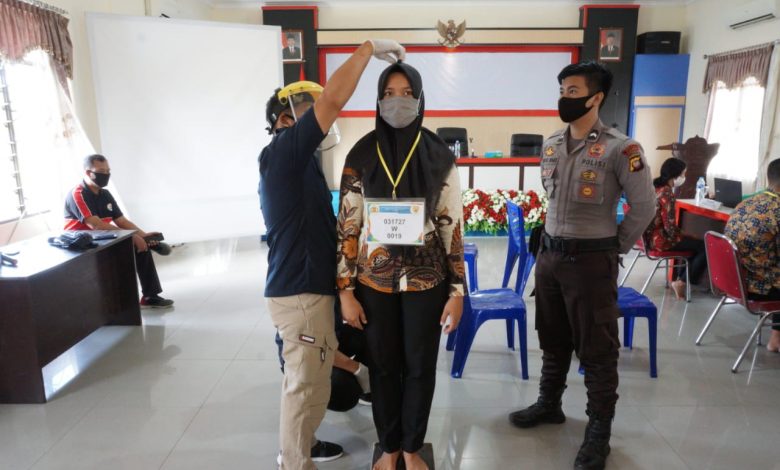 Sebelum memasuki ruang pemeriksaan di aula Bhayangkara Patriatama, para peserta diwajibkan patuh protokol kesehatan seperti pengecekan suhu tubuh, wajib memakai masker dan phisycal distancing.