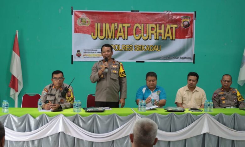BeritaNasional.ID, SEKADAU KALBAR – Polres Sekadau mengelar Jumat Curhat di Kantor Desa Mungguk, Kecamatan Sekadau Hilir pada Jumat (19/1/2024). Kegiatan ini dihadiri oleh Kapolres Sekadau AKBP Dr. I Nyoman Sudama S.I.K., M.Si., Wakil Bupati Sekadau Subandrio, S.H., M.H., Kasat Binmas AKP Masdar, Kasat Intelkam IPTU Didik, Kasat Lantas IPTU Pandi, Kades Mungguk Abang Irwandi, para Kadus, Tokoh Agama, Tokoh Pemuda, Tokoh Masyarakat, serta Warga Desa Mungguk