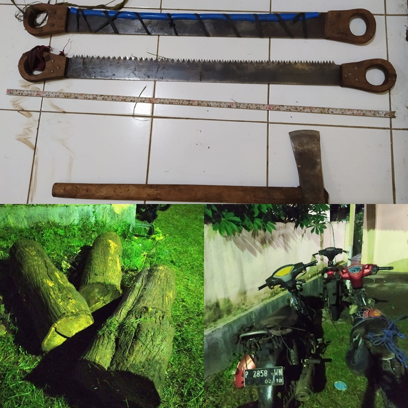 Sekitar 45 menit kemudian, muncul 3 unit sepeda motor dari arah Timur yang dicurigai membawa kayu jati hasil hutan kemudian diberhentikan. Selanjutnya kedua warga diduga pelaku berhasil diamankan berikut barang bukti sedangka 1 orang lainnya melarikan diri dengan meninggalkan sepeda motor dan kayu jati.