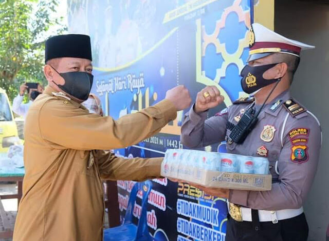 Pada saat pelaksanaan pengecekan Pos PAM Penyekatan arus mudik Idul Adha 2021 Forkopimda Kota Tanjungbalai memberikan bingkisan kepada  petugas yang bertugas di Pos Penyekatan.(As18)