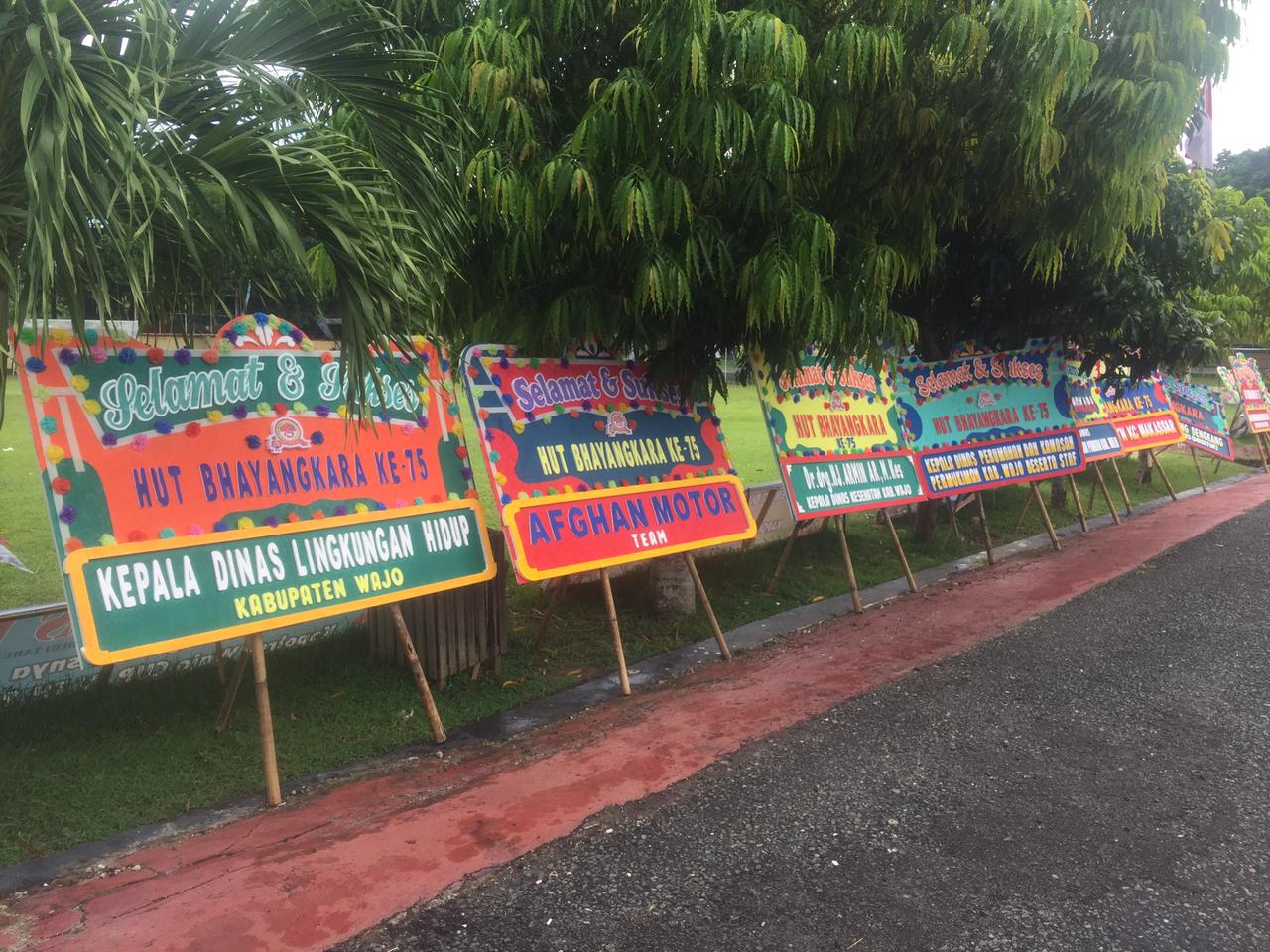 Sejumlah karangan bunga yang mewarnai halaman polres Wajo merupakah ucapan selamat hari ulang tahun (HUT) Bhayangkara Ke-75 Tahun dari berbagai kalangan.