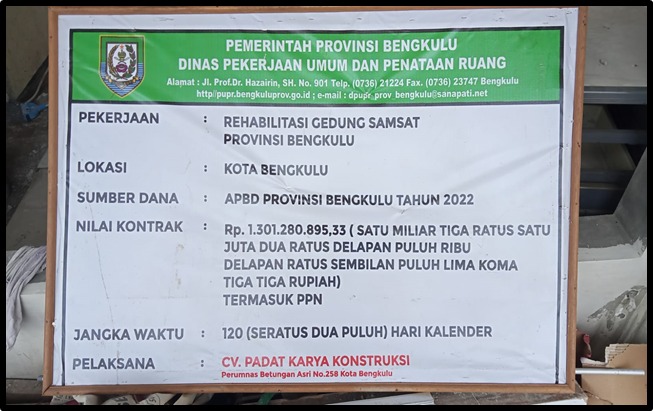 Rehabilitasi Samsat yang berada di Kota Bengkulu ini didanai APBD Provinsi 2022 dengan plot anggaran 1,3 miliar. “Proses pelaksaan sudah berjalan dan akan segera selesai, ” kata Plt Kadis PUPR Provinsi, Tejo Suroso, Jumat 25 November 2022.