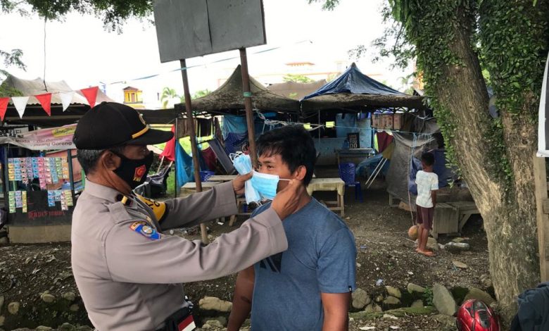 BeritaNasional.id, Sulbar -Anggota Satuan Binmas Polres Mamuju Tengah (Mateng) melaksanakan pembagian masker dan hand sanitizer, Selain membagi masker sembari menghimbau masyarakat agar mematuhi Protokol Kesehatan 3M