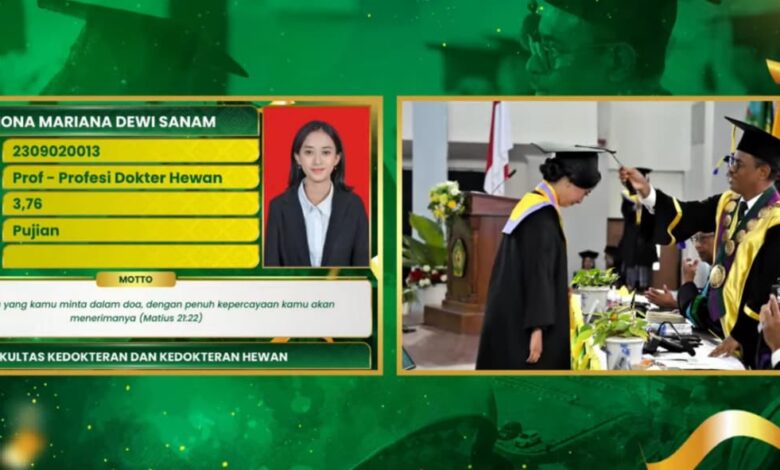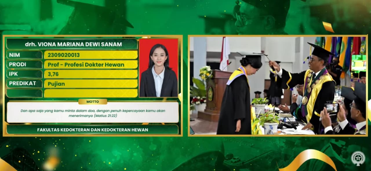 Namun, ada hal yang membuat wisuda kali ini berbeda dan sarat makna. Di tengah ribuan wisudawan, putri bungsu Rektor, drh. Viona Mariana Dewi Sanam, turut diwisuda setelah menyelesaikan studinya di Fakultas Kedokteran dan Kedokteran Hewan (FKKH).