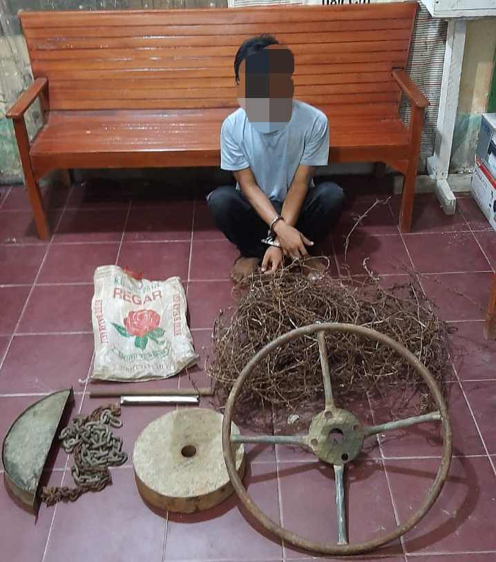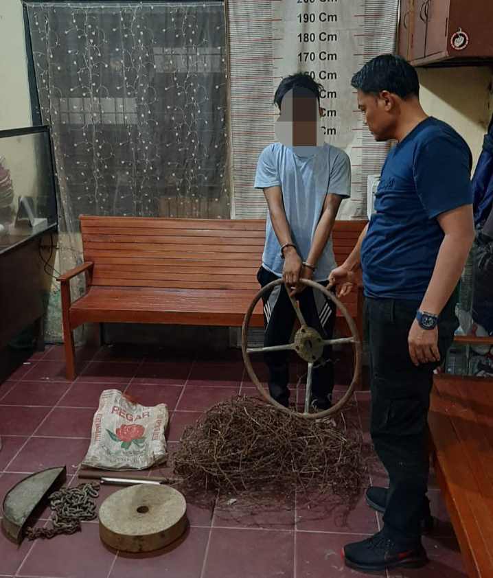 “Tersangka sudah diamankan, berikut Barang Bukti (BB) milik korban, seperti kawat duri panjang lebih kurang 50 meter, 1 buah roda molen, 1 buah setir molen, 1 buah tutup roda angin molen, dan 2 buah rantai besi panjang lebih kurang 1 meter,” bebernya IPTU Hermawan, sembari mengatakan, pelaku sudah pernah dihukum, dan kini melakukan perbuatan Curat. (Reza)