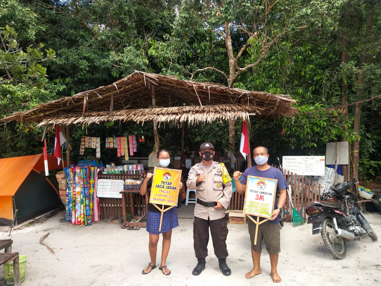 Brigpol Agung bersama rekannya menyampaikankan sosialisasi tentang penerapan protokol kesehatan kepada pihak pengelola maupun masyarakat yang mengunjungi tempat wisata tersebut.