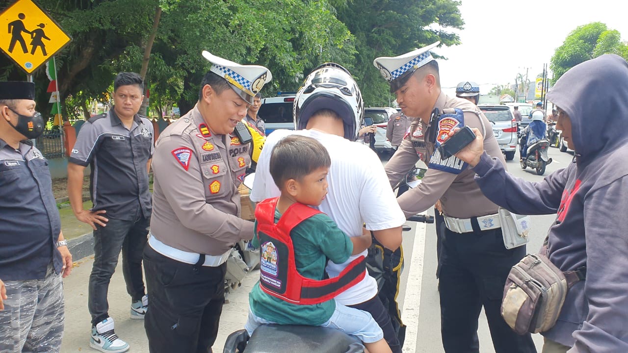 “Pengendara yang ditemukan membawa anak Balita mendapat sabuk pengaman secara gratis dan dipasangkan langsung di tempat, Anak usia empat sampai lima tahun yang dibonceng ini diberikan sabuk dan duduk dibelakang”.