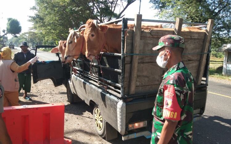 Penyekatan dan pemeriksaan perdagangan hewan ternak dalam rangka antisipasi Penyeberan PMK pada hewan ternak ini, berlangsung di depan Mapolsek Banyuglugur Kabupaten Situbondo dilakukan oleh Satgas PMK Kecamatan Banyuglugur.