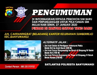 “Kita informasikan kepada seluruh masyarakat Banyuwangi, bahwa mulai hari Senin, 27 Januari 2020 pelayanan pemohon SIM, baik perpanjangan maupun pemohon baru, sudah pindah ke kantor Satpas Polresta Banyuwangi yang baru,” terang Aiptu Andik Purwo Laksono, Baur SIM Satlantas Polresta Banyuwangi.