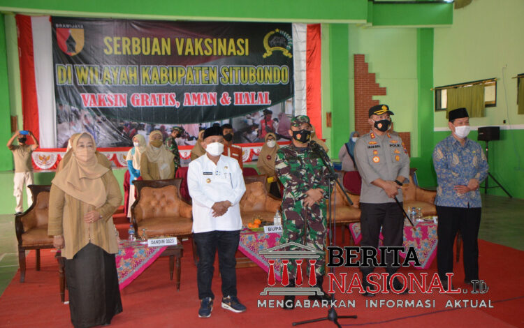 BeritaNasional.ID, SITUBONDO, JAWA TIMUR – Forum Koordinasi Pimpinan Daerah Situbondo bersama Panglima TNI dan Kqpolri tinjau serbuan vaksinasi secara virtual di SMP Negeri 1 Situbondo, Jum’at (15/10/2021).