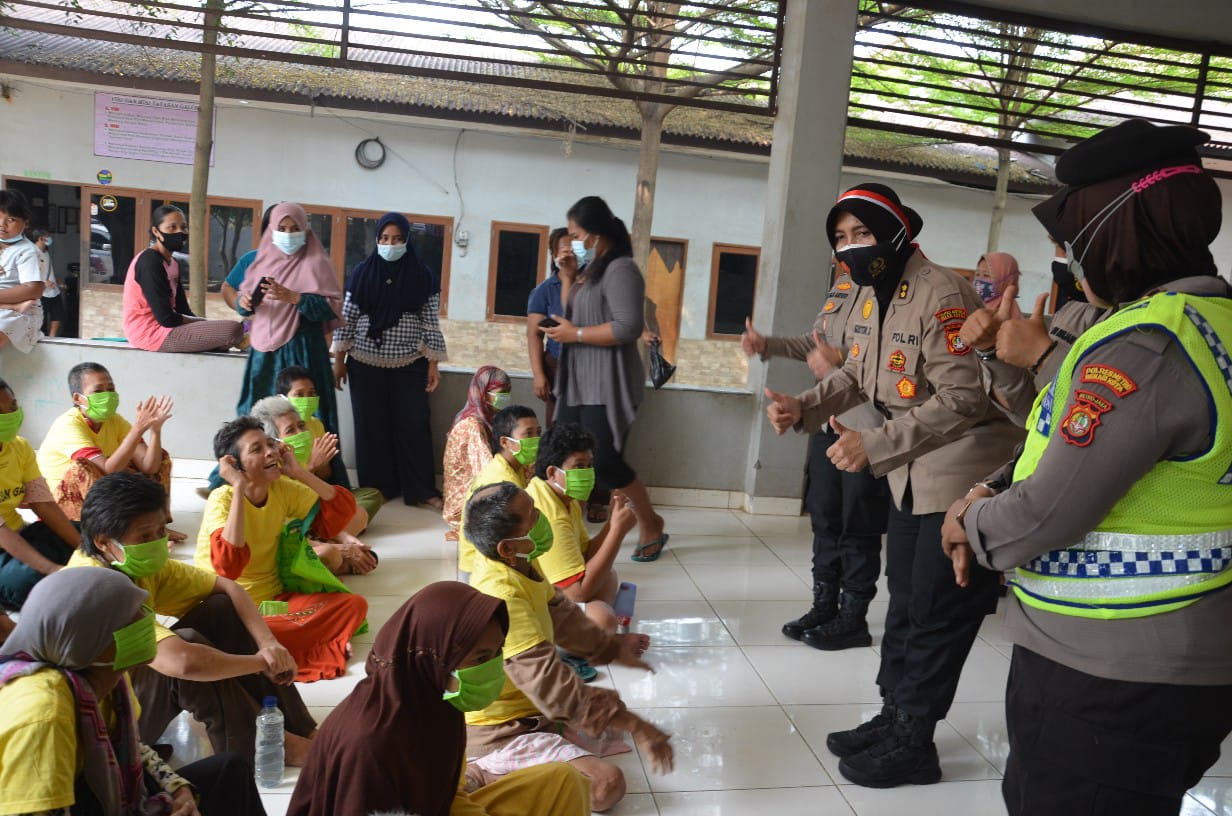 Para polwan yang dipimpin oleh Kabag Sumda Polrestro Bekasi Kota AKBP. Agustin.S disambut sotak gembira oleh para warga binaan yayasan Galuh yang merawat pasien ODGJ.