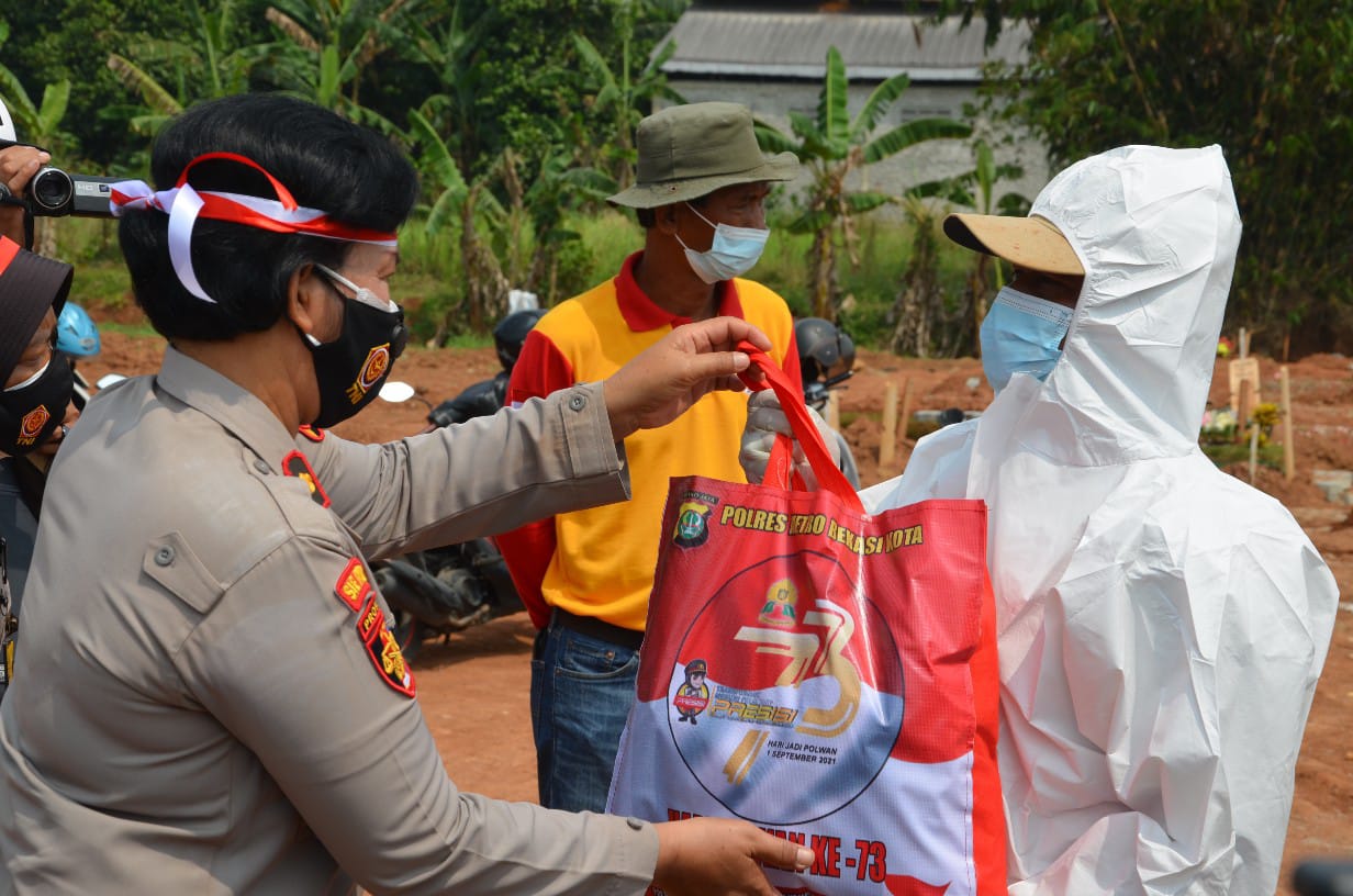 Selain di yayasan Galuh, para polwan juga bergerak langsung ke TPU Pedurenan tempat pemakaman pasien Covid-19. Mereka memberikan langsung bantuan sembako kepada para petugas pemakaman dan pemulasaran jenazah covid-19.
