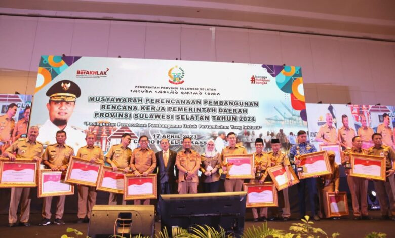 Penghargaan tersebut diterima langsung Bupati Wajo, Amran Mahmud yang diserahkan Gubernur Sulawesi Selatan, Andi Sudirman Sulaiman pada Kegiatan Musyawarah Perencanaan Pembangunan (Musrenbang) Rencana Kerja Pemerintah Provinsi Sulsel Tahun 2024 yang digelar di Hotel Claro, Makassar, Senin (17/4/2023).