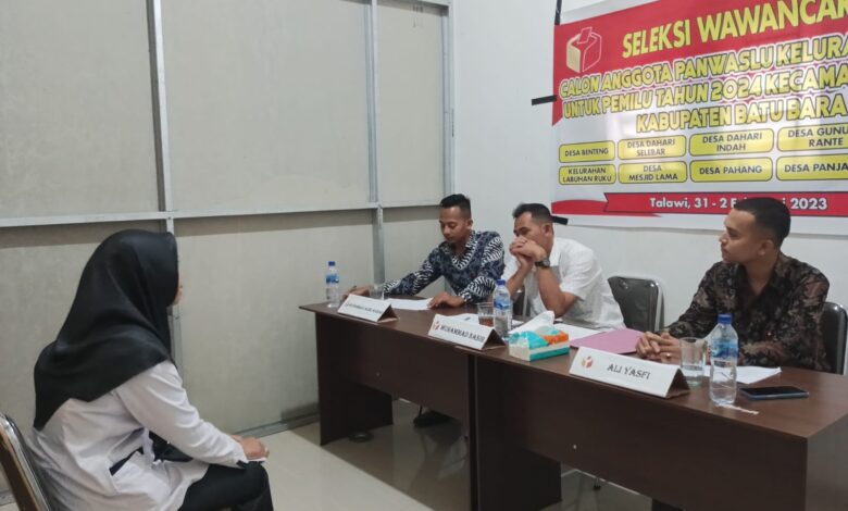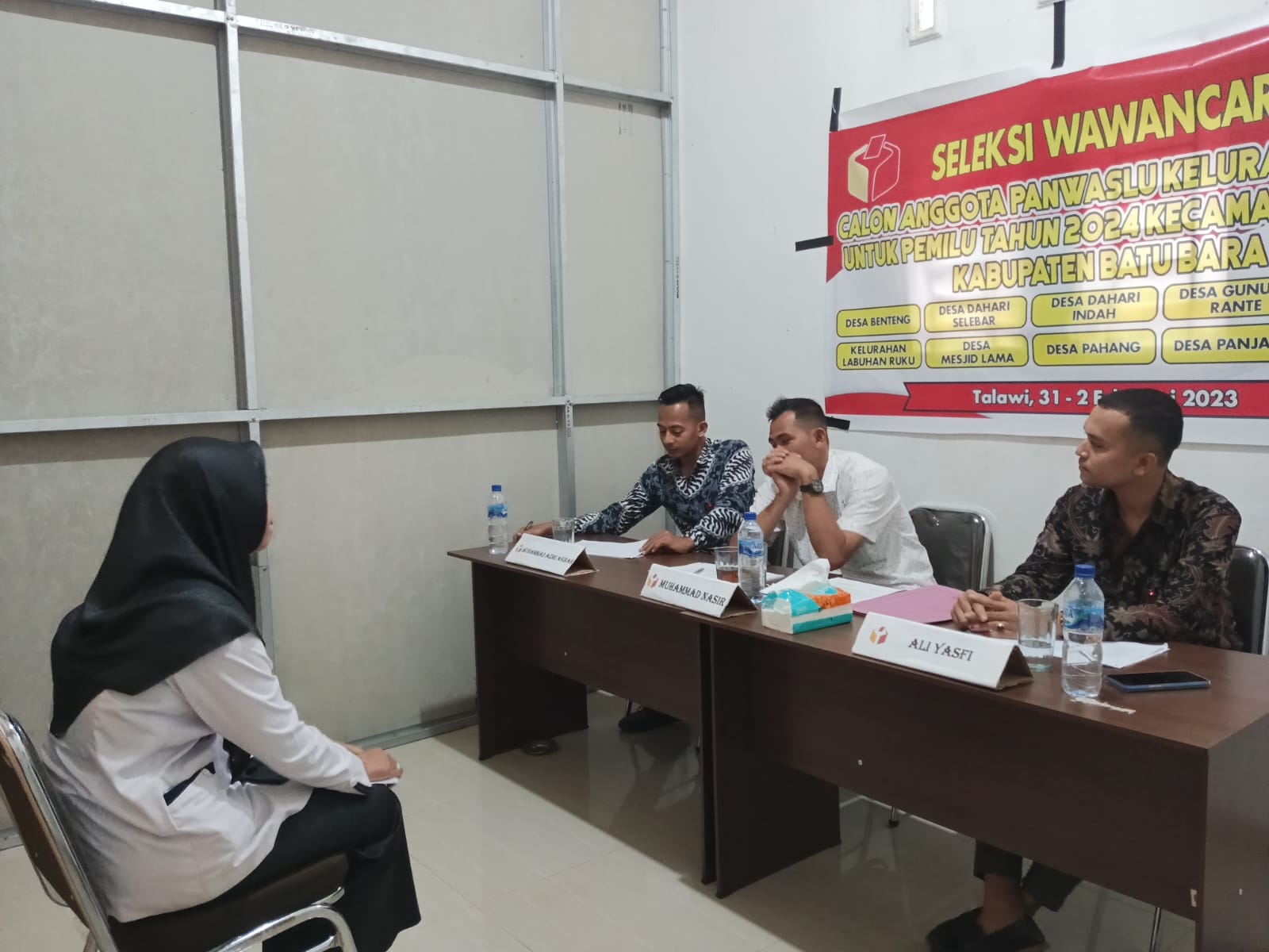 BeritaNasional.ID, Batu Bara Sumut – Panitia Pengawas Pemilihan Umum Kecamatan (Panwascam) Talawi Kabupaten Batubara laksanakan tes wawancara Penwaslu Kelurahan/Desa (PKD) pada Pemilihan Umum 2024 mendatang.