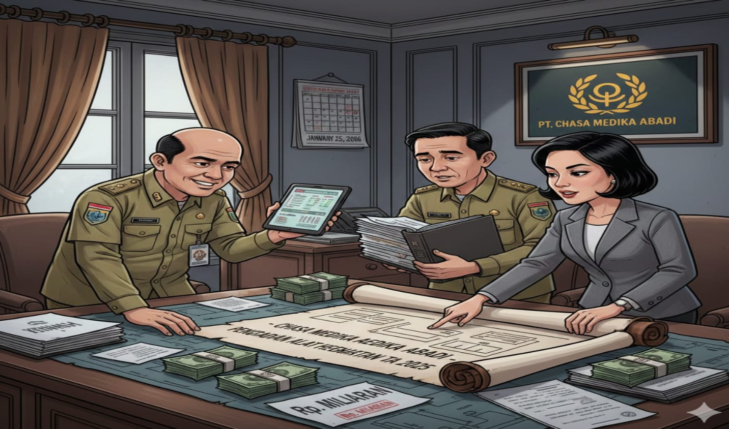 22 Januari 2025: RC bersama AA dan RA menandatangani perjanjian kerja sama pembiayaan proyek Alkes dengan modal kerja sebesar Rp 5.227.080.125. Dana tersebut dikirim RC kepada AA dan RA, lengkap dengan bukti transfer.