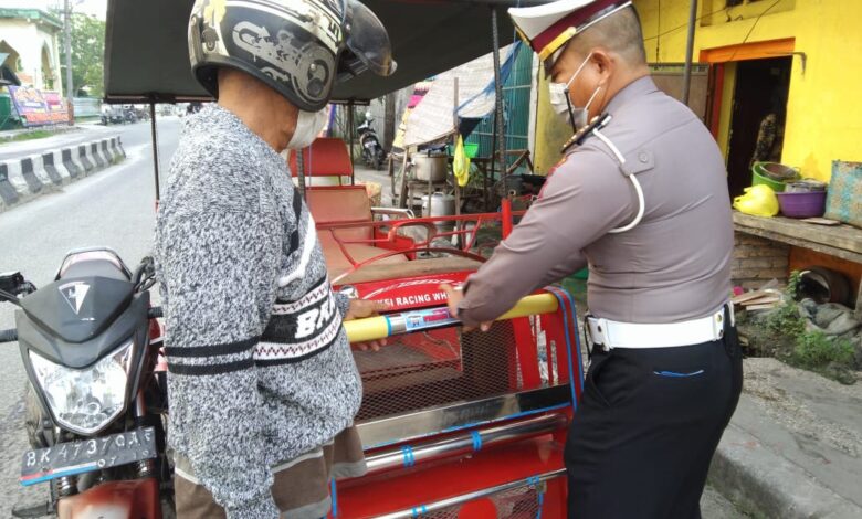 Sosialisasi pencegahan Virus Corona dan Penempelan Stiker “Ayo Pakai Masker” terus dilaksanakan Sat Lantas Tanjungbalai
